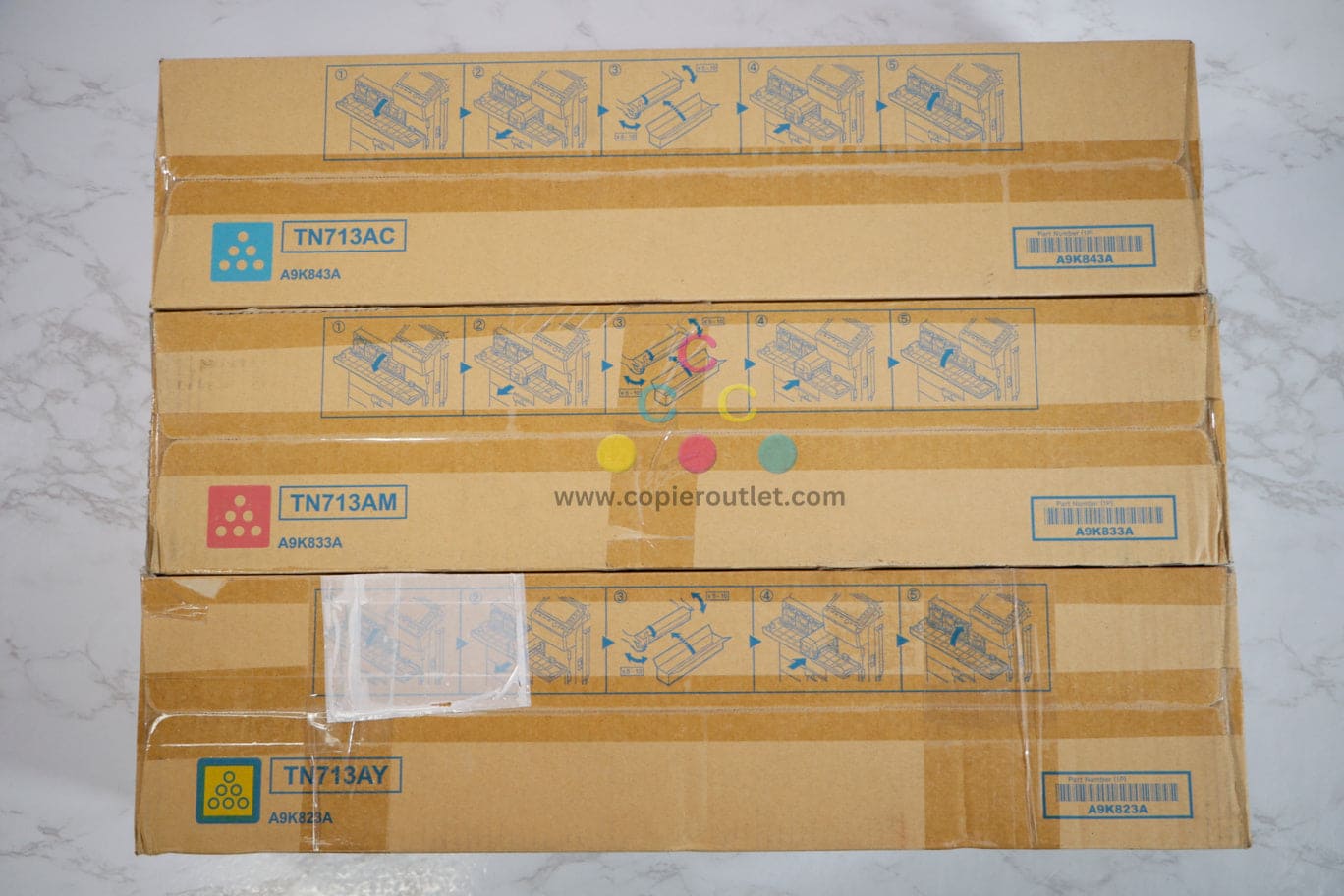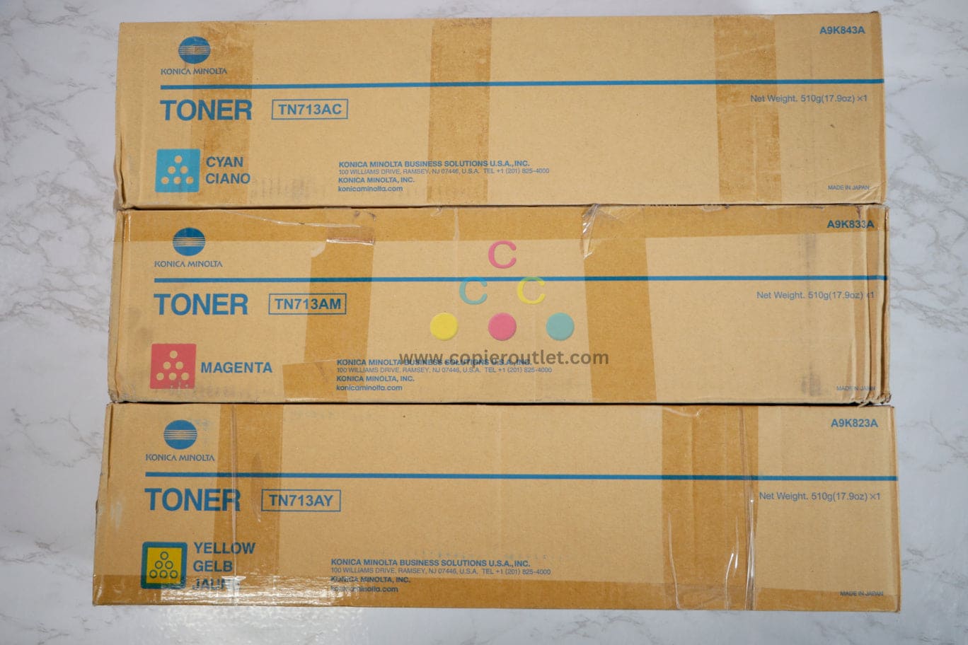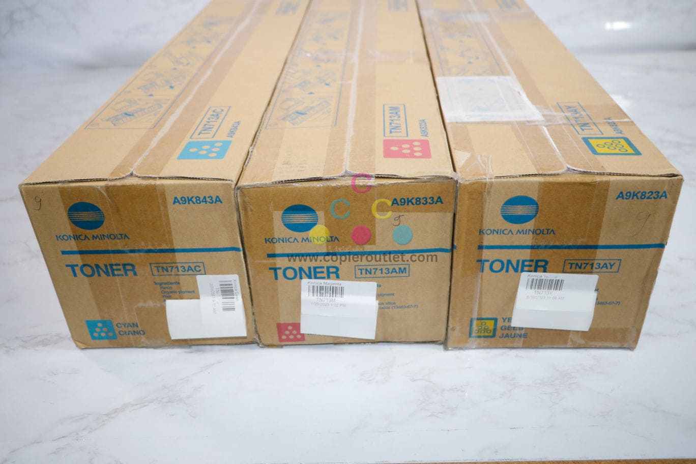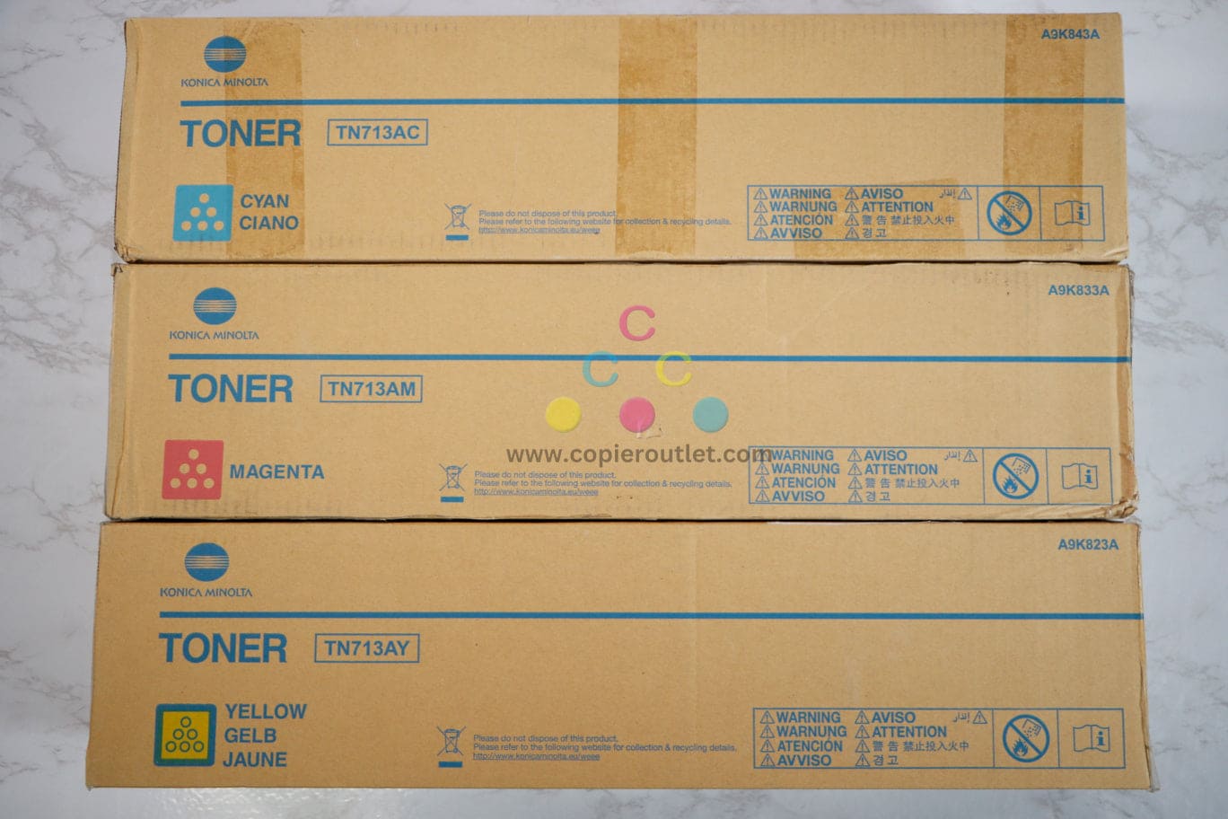 3 New OEM Konica Minolta Bizhub C659,C759 CMY Toners TN713AC,TN713AM,TN713AY